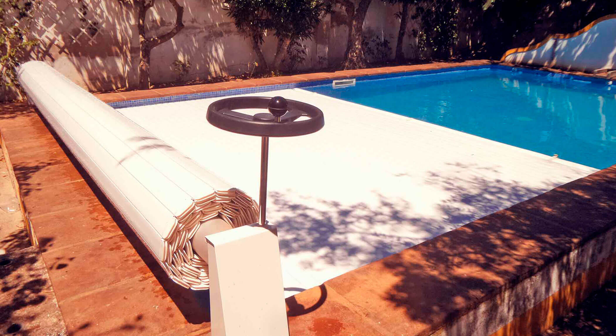 • O volante, está posicionado verticalmente facilitando o enrolar e desenrolar da cobertura.