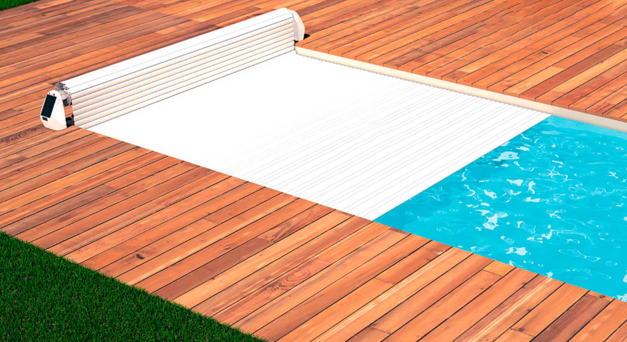 Cobertura com 2 suportes laterais lacados a branco para fixação na bordadura da piscina – instalação fácil e rápida.