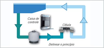A água da piscina deve, em primeiro lugar, estar ligeiramente salgada 4-6 g/litro (água do mar 35 g/litro). A eletrólise é realizada por uma célula inserida no circuito de filtração. Esta operação liberta iões que desinfetam a água e retorna-a em sal novamente.
